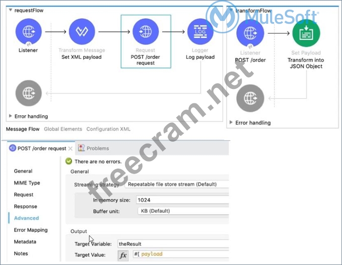 In the requestFlow an HTTP Request operation is configured to send an HTTP request with an XML payload.