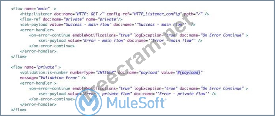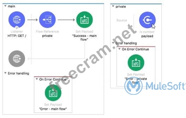 The correct answer is C as On errror continue in private flow will not result in error, the error handling having ON error continue will allow to continue the flow further and will result in 'Success Main Flow'
