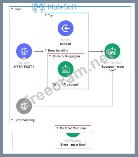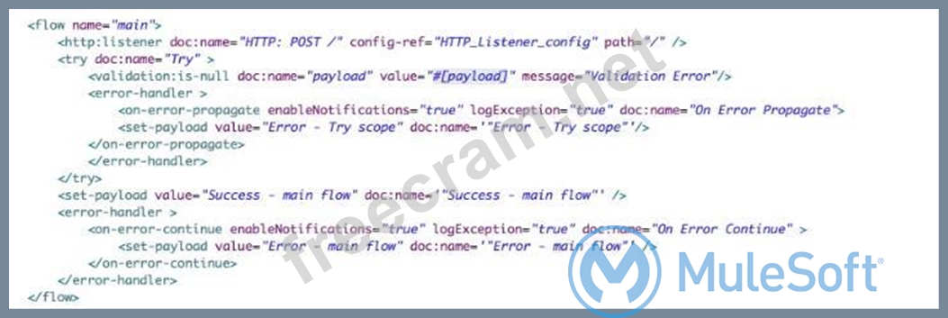 Refer to the exhibits. The Validation component in the Try scope throws an error. What response message is returned to a client request to the main flow's HTTP Listener? The Validation component in the Try scope throws an error. What response message is returned to a client request to the main flow's HTTP Listener?