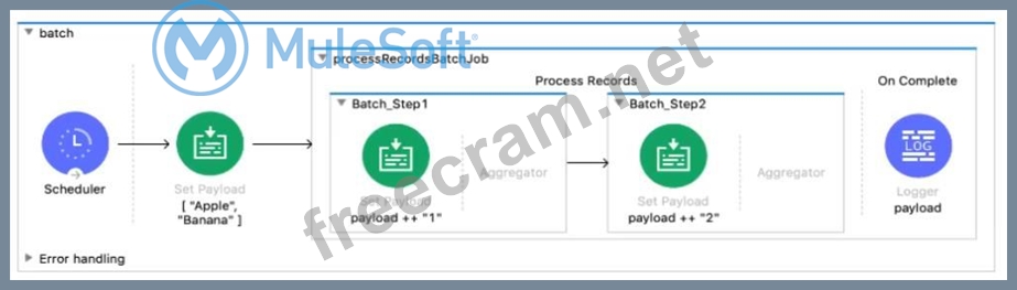 Refer to the exhibit. The input array of strings is passed to the batch job, which does NOT do any filtering or aggregating. What payload is logged by the Logger component?