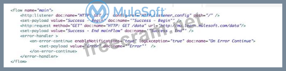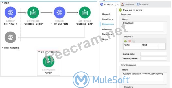 Refer to the exhibits. A web client submits a request to the HTTP Listener and the HTTP Request throws an error. What payload and status code are returned to the web client? Refer to the exhibits. A web client submits a request to the HTTP Listener and the HTTP Request throws an error. What payload and status code are returned to the web client?