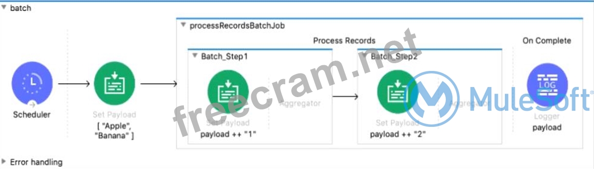 Refer to the exhibit. The input array of strings is passed to the batch job, which does NOT do any filtering or aggregating. What payload is logged by the Logger component?