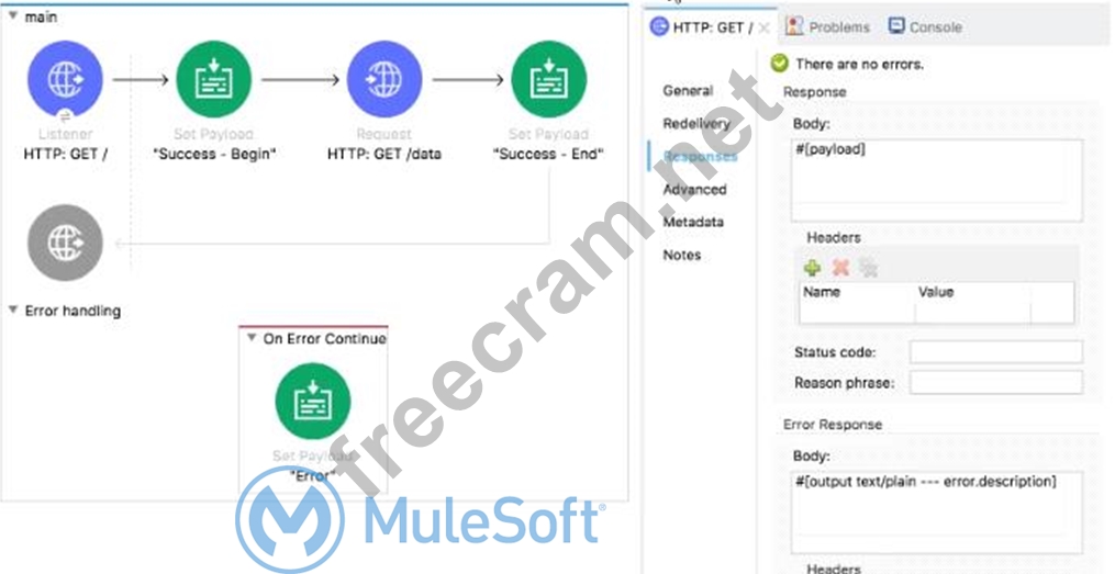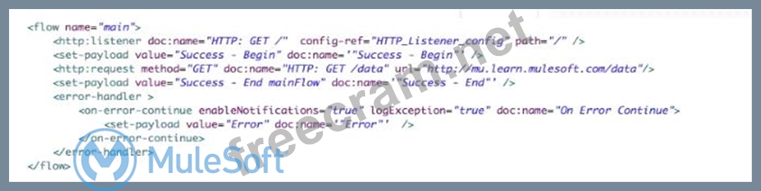 3) The On Error Continue scope handles the error. When On Error Continue scope is invoked, all the processors in error block are executed and success response is sent back to the client with payload which is set in error flow. In this case payload is set to "Error" value in error block.