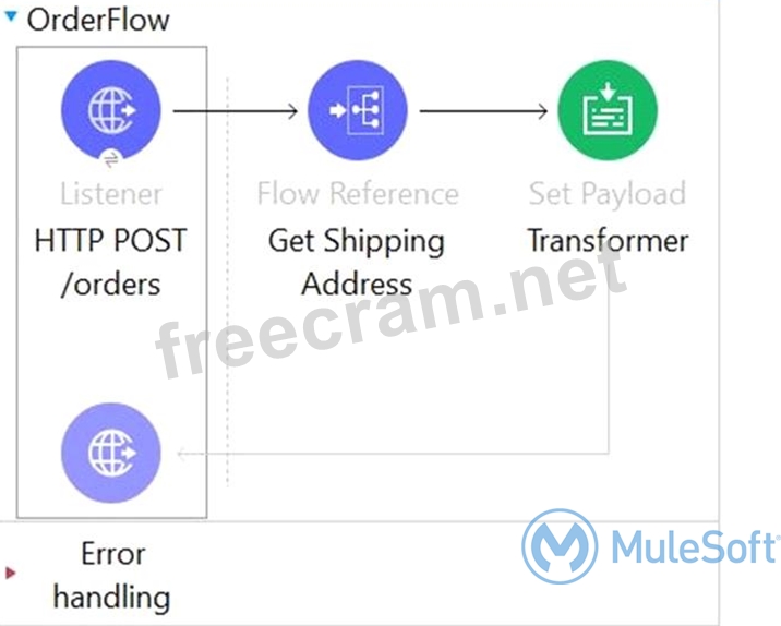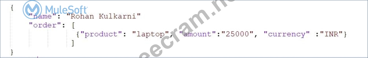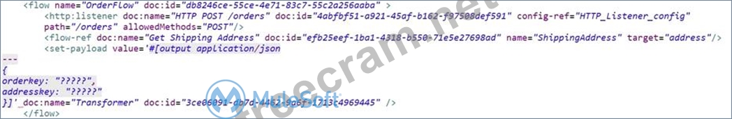 Refer to the exhibits. This main mule application calls a separate flow called as ShippingAddress which returns the address corresponding to the name of the user sent to it as input. Output of this ShippingAddress is stored in a target variable named address. Next set of requirement is to have a setPayload transformer which will set below two values 1) orderkey which needs to set to be equal to the order element received in the original request payload. 2) addressKey which needs to be set to be equal to the address received in response of ShippingAddress flow What is the straightforward way to properly configure the Set Payload transformer with the required data? A mule application is being developed which will process POST requests coming from clients containing the name and order information. Sample request is as below