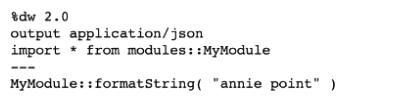 A Mule project contains a DataWeave module called MyModule.dwl that defines a function named formatString. The module is located in the project's src/main/resources/modules folder.