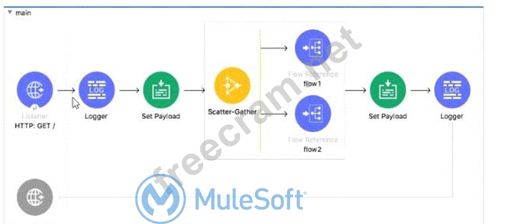 In the execution of the Scatter_Gather, the flow1 route completes after 10 seconds and the flow2 route completes after 20 seconds.