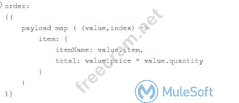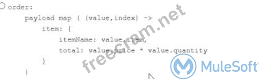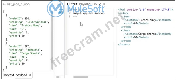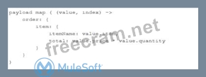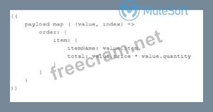 This kind of questions are best solved with filtering technique. Key thing to note here is XML attributes are always access by @ notation. So in this example orderId can be accessed as @OrderId which makes option 3 and option 4 false. Now difference in optin and option 2 is in mapping of lineItemPrice. Correct syntax to format a String in Numbse is value.price as Number. Hence option 2 is correct