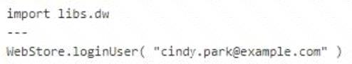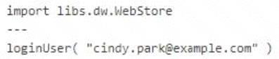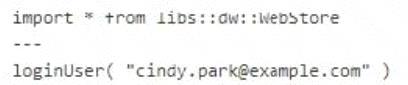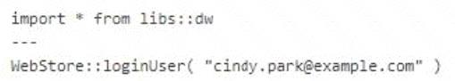 A Mule project contains a DataWeave module file WebStore dvA that defines a function named loginUser The module file is located in the projects src/main/resources/libs/dw folder What is correct DataWeave code to import all of the WebStore.dwl file's functions and then call the loginUser function for the login "[email protected]"?