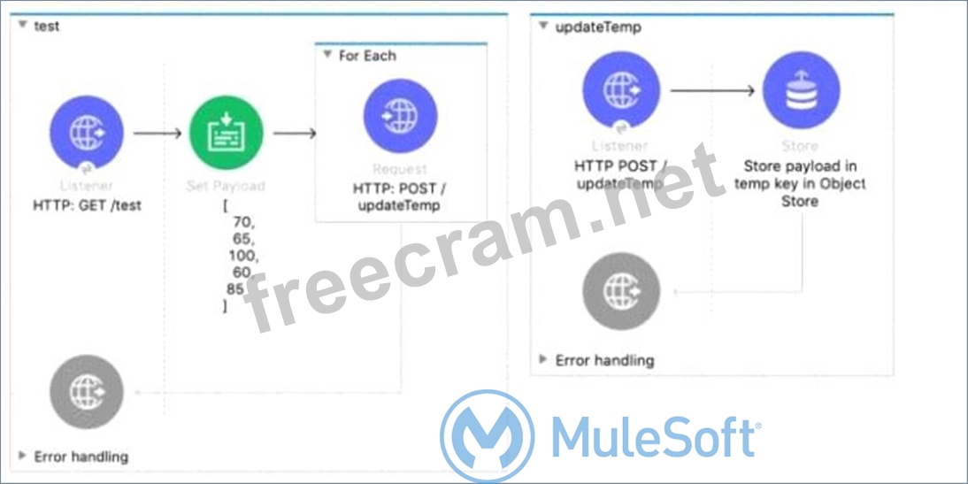 A web client sends one GET request to the test flow's HTTP Listener, which causes the test flow to call the updateTemp flow After the test flow returns a response, the web client then sends a different GET request to trie getTemp flow's HTTP Listener The test flow is not called a second time.