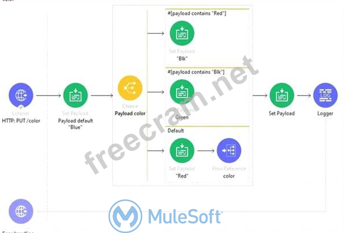 Sequence can be described as follows. * When web client sends the request , it sends payload as Blue (mentioned in question) * In first iteration this will go to default choice , which sets payload to Red * Via default route , flow will call itself with payload as Red * In second iteration , as payload is Red , it will go to first route in choice router which will set payload to Blk and second iteration will end returning back payload as Blk to first iteration. * This Blk will be again set to payload and first iteration will end returning back response as Blk