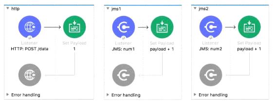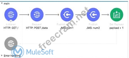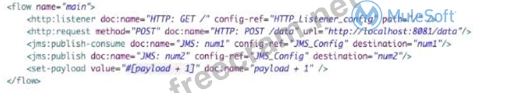 The flow can be described as below. 1) First HTTP POST requets is made in which paylaod is set to 1 and it gets returned to our mail flow. 2) Second call is initiated for JMS Publish Consume JMS: num1 which add 1 to the payload which makes it as 2. Note that pubih consume is a synchronous operation. Hence paylaod is returned to main flow. 3) Third call is initiated for JMS Publish JMS: num2 which add 1 to the payload . Note that pubih is asynchronous operation. Hence paylaod is never returned to main flow. So payload in main flow is still 2. 4) Finally Set Payload increments payload by 1 making payload as 3 which is returned by the flow. Hence option 3 is the correct answer.