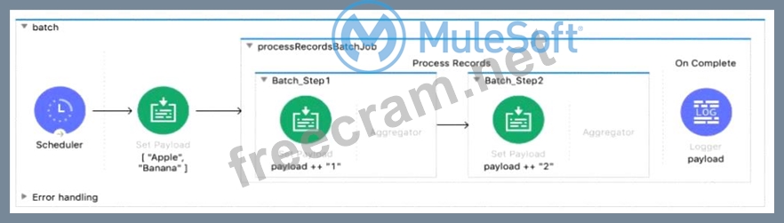 Refer to the exhibit. The input array of strings is passed to the batch job, which does NOT do any filtering or aggregating. What payload is logged by the Logger component?