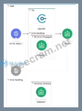 Refer to the exhibits. A web client sends a POST request to the HTTP Listener and the Validation component in the Try scope throws an error.