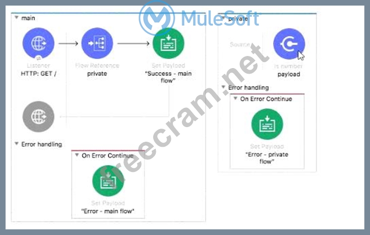 Error in validation component will get processed by Processer level On Error Propagate block and then error will be rethrown which will get processed by flow level error handler which will set payload to "Error- main flow". Hence correct answer is Error - main flow