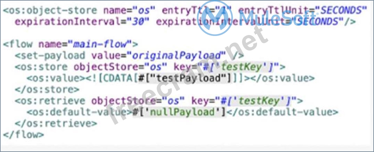 Explanation The result of the flow is nullPayload if processing between os:store and os:retrieve takes 10 seconds. This is because the entry TTL of the object store is one second, which means that any stored value expires after one second and is removed from the object store. The expiration interval of 30 seconds only determines how often the object store checks for expired values, but it does not affect the TTL. Therefore, when os:retrieve tries to get the value after 10 seconds, it returns nullPayload because the value has already expired and been removed. References: https://docs.mulesoft.com/object-store/osv2-faq#how-does-the-time-to-live-work