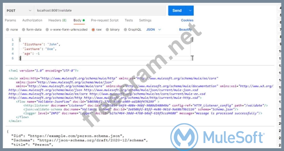 Explanation Based on the code snippet, schema.json file, and payload below, the outcome of the given code snippet when a request is sent with the payload is that the Mule flow will throw the exception 'JSON:SCHEMA_NOT_HONOURED'. This is because the payload does not conform to the schema.json file, which specifies that age must be a number greater than or equal to zero. The payload has age as a string with a negative value, which violates the schema. Therefore, the validate-schema operation throws an error with type 'JSON:SCHEMA_NOT_HONOURED'. References: https://docs.mulesoft.com/json-module/1.1/json-validate-schema