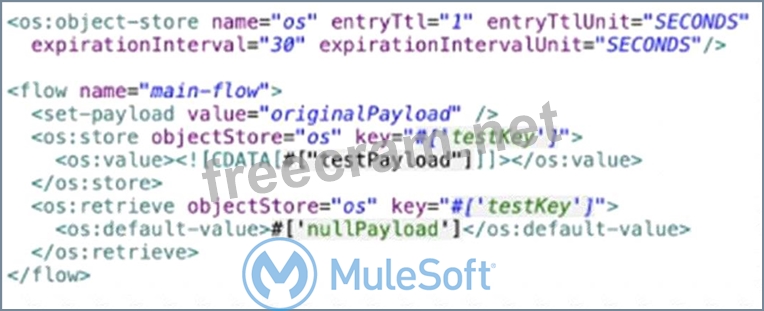 The result of the flow is nullPayload if processing between os:store and os:retrieve takes 10 seconds. This is because the entry TTL of the object store is one second, which means that any stored value expires after one second and is removed from the object store. The expiration interval of 30 seconds only determines how often the object store checks for expired values, but it does not affect the TTL. Therefore, when os:retrieve tries to get the value after 10 seconds, it returns nullPayload because the value has already expired and been removed. References:https://docs.mulesoft.com/object-store/osv2-faq#how-does-the-time-to-live-work