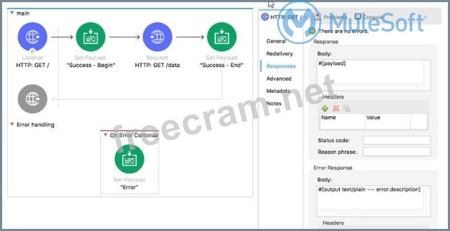 Refer to the exhibits. A web client submits a request to the HTTP Listener and the HTTP Request throws an error. What payload and status code are returned to the web client? Refer to the exhibits. A web client submits a request to the HTTP Listener and the HTTP Request throws an error. What payload and status code are returned to the web client?