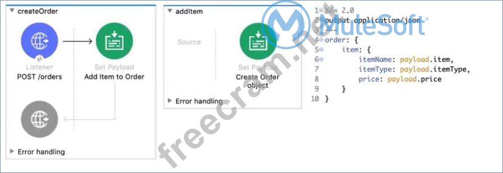 Refer to the exhibits. The Set Payload transformer In the addltem subflow uses DataWeave to create an order object. What is the correct DataWeave code for the Set Payload transformer in the createOrder flow to use the addltem subflow to add a router cable with the price of 100 to the order?