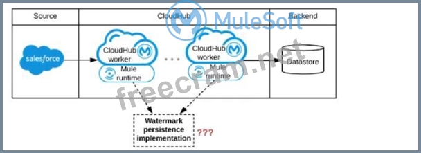 Refer to the exhibit. A Mule application is being designed to be deployed to several CIoudHub workers. The Mule application's integration logic is to replicate changed Accounts from Satesforce to a backend system every 5 minutes. A watermark will be used to only retrieve those Satesforce Accounts that have been modified since the last time the integration logic ran. What is the most appropriate way to implement persistence for the watermark in order to support the required data replication integration logic?