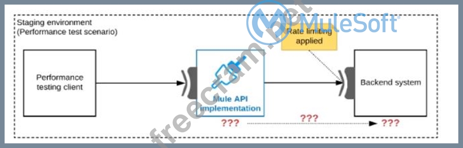 Refer to the exhibit. One of the backend systems invoked by an API implementation enforces rate limits on the number of requests a particular client can make. Both the backend system and the API implementation are deployed to several non-production environments in addition to production. Rate limiting of the backend system applies to all non-production environments. The production environment, however, does NOT have any rate limiting. What is the most effective approach to conduct performance tests of the API implementation in a staging (non-production) environment?