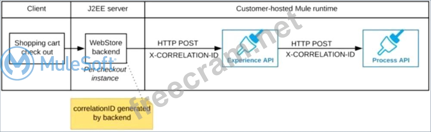 Correct answer is "The web store backend generates a new correlation ID value at the start of checkout and sets it on the X-CORRELATION-ID HTTP request header in each API invocation belonging to that checkout No special code or configuration is included in the Experience API and Process API implementations to generate and manage the correlation ID" : By design, Correlation Ids cannot be changed within a flow in Mule 4 applications and can be set only at source. This ID is part of the Event Context and is generated as soon as the message is received by the application. When a HTTP Request is received, the request is inspected for "X-Correlation-Id" header. If "X-Correlation-Id" header is present, HTTP connector uses this as the Correlation Id. If "X-Correlation-Id" header is NOT present, a Correlation Id is randomly generated. For Incoming HTTP Requests: In order to set a custom Correlation Id, the client invoking the HTTP request must set "X-Correlation-Id" header. This will ensure that the Mule Flow uses this Correlation Id. For Outgoing HTTP Requests: You can also propagate the existing Correlation Id to downstream APIs. By default, all outgoing HTTP Requests send "X-Correlation-Id" header. However, you can choose to set a different value to "X-Correlation-Id" header or set "Send Correlation Id" to NEVER.