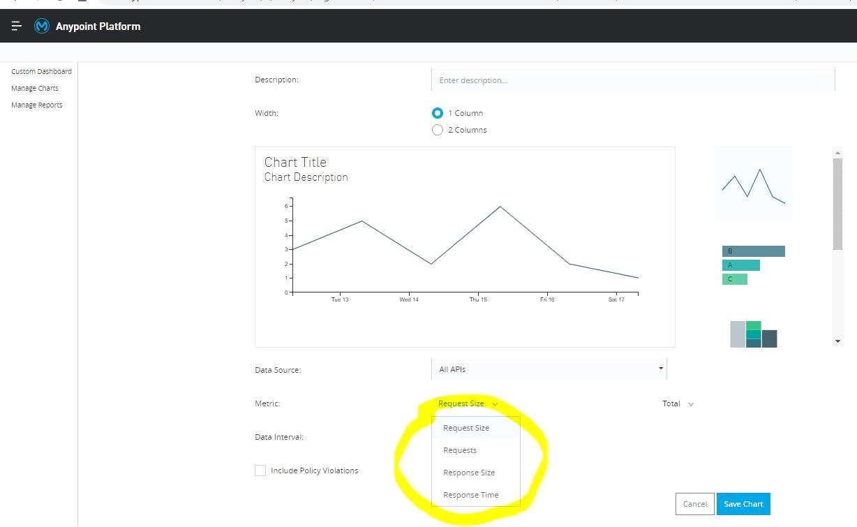 The custom dashboard in Anypoint Analytics contains a set of charts for a single API or for all APIs Each chart displays various API characteristics