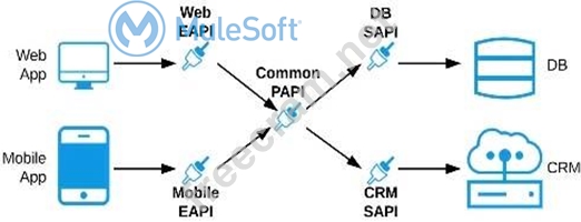 Hence the correct answer is: Separate Experience APIs for the mobile and web app, but a common Process API that invokes separate System APIs created for the database and CRM system