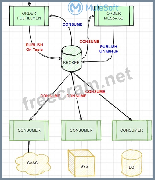 * If you need to scale a JMS provider/ message broker, - add nodes to scale it horizontally or - add memory to scale it vertically * Cons of adding another JMS provider/ message broker: - adds cost. - adds complexity to use two JMS brokers - adds Operational overhead if we use two brokers, say, ActiveMQ and IBM MQ * So Two options that mention to use two brokers are not best choice. * It's mentioned that "The Fulfillment microservice consumes Order messages, fulfills the order described therein, and then publishes an OrderFulfilled message. Each OrderFulfilled message can be consumed by any interested Mule application." - When you publish a message on a topic, it goes to all the subscribers who are interested - so zero to many subscribers will receive a copy of the message. - When you send a message on a queue, it will be received by exactly one consumer. * As we need multiple consumers to consume the message below option is not valid choice: "Order messages are sent to an Anypoint MQ exchange. OrderFulfilled messages are sent to an Anypoint MQ queue. Both microservices interact with Anypoint MQ as the message broker, which must therefore scale to support the load of both microservices" * Order messages are only consumed by one Mule application, the Fulfillment microservice, so we will publish it on queue and OrderFulfilled message can be consumed by any interested Mule application so it need to be published on Topic using same broker.