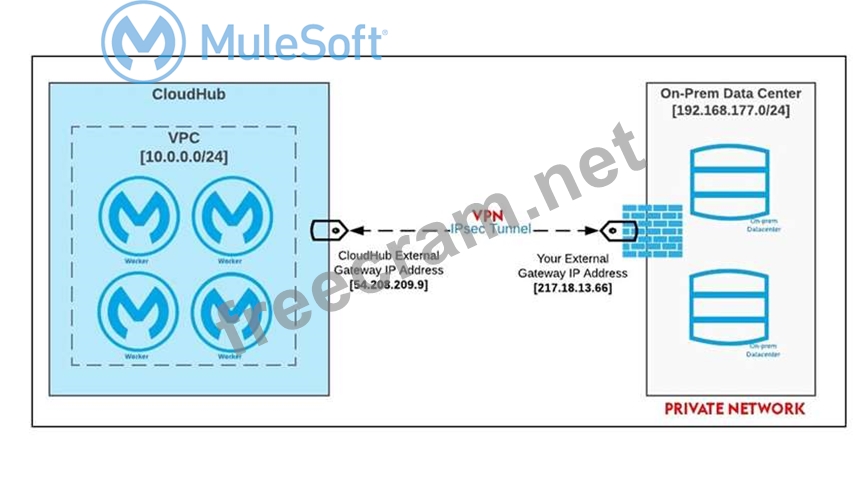 * Correct answer: "An Anypoint VPC connected to the on-premises network using an IPsec tunnel or AWS DirectConnect, plus matching firewall rules in the VPC and on-premises network" IPsec Tunnel You can use an IPsec tunnel with network-to-network configuration to connect your on-premises data centers to your Anypoint VPC. An IPsec VPN tunnel is generally the recommended solution for VPC to on-premises connectivity, as it provides a standardized, secure way to connect. This method also integrates well with existing IT infrastructure such as routers and appliances. Reference: https://docs.mulesoft.com/runtime-manager/vpc-connectivity-methods-concept