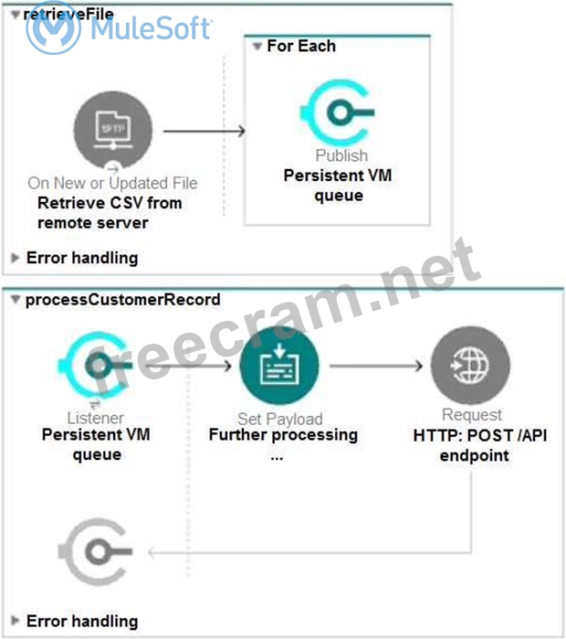 Refer to the exhibit. This Mule application is deployed to multiple CloudHub workers with persistent queues enabled.