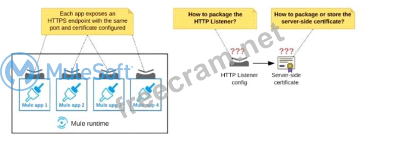Correct answer is Package the HTTPS Listener configuration in a Mule DOMAIN project, referencing it from all Mule applications that need to expose an HTTPS endpoint. Store the server-side certificate in a shared filesystem location in the Mule runtime's classpath, OUTSIDE the Mule DOMAIN or any Mule APPLICATION.