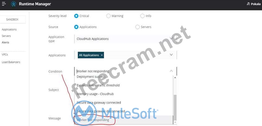 Correct answer: Configure a "Worker not responding" alert in Anypoint Runtime Manager.