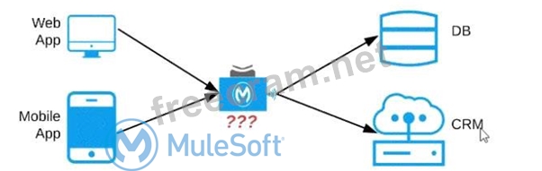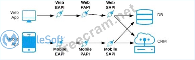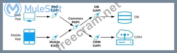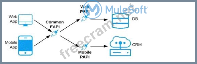 C) Separate Experience APIs for the mobile and web app, but a common Process API that invokes separate System APIs created for the database and CRM system