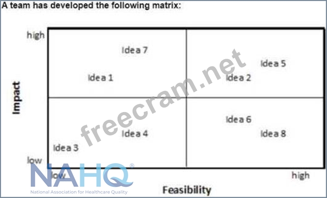 Based on the matrix provided, ideas 2 and 5 should be addressed first because they are in the quadrant that represents both high impact and high feasibility. Prioritizing ideas that are both highly feasible and likely to have a significant impact ensures that the organization can quickly and effectively implement changes that will yield the most benefit.