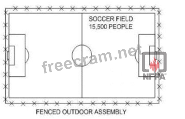 The total width of exits required is determined by calculating the number of occupants and applying the required exit width per occupant based on the applicable building or fire code (such as NFPA 101, Life Safety Code). For a large assembly occupancy such as a soccer field with 15,500 people, the exit width would be calculated using a standard factor (usually in inches or millimeters per person) to ensure that all occupants can evacuate safely in an emergency. Based on standard exit width factors and the number of people, the correct total exit width required is approximately6,200 inches (157,500 mm).