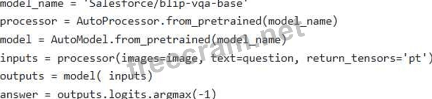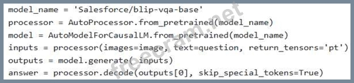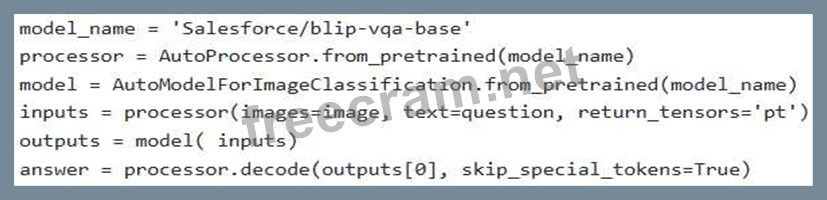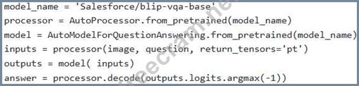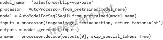 Consider the following Python code snippet utilizing the Hugging Face Transformers library for multimodal processing. The objective is to perform visual question answering (VQA). Assume 'image' is a PIL Image object and 'question' is a string. However, the code is incomplete. Choose the options to complete the code.