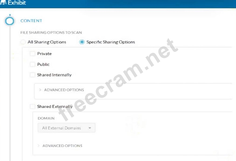 To detect files containing sensitive data that are shared outside of the organization, the administrator should select both "Shared Externally" and "Public" sharing options. These settings ensure that any files shared externally (outside the organization) or publicly are scanned for sensitive data. This comprehensive approach covers all potential scenarios where data could be exposed outside the organization. Step-by-Step Configuration: Select Specific Sharing Options: Navigate to the CASB API-enabled Protection policy configuration page. Choose the option for "Specific Sharing Options" to limit the scan to files shared under certain conditions. Enable Shared Externally and Public: Check both "Shared Externally" and "Public" options. This setting ensures that files shared either publicly or with external domains are included in the scan. Configure Advanced Options: For further granularity, configure the advanced options under each sharing type if needed (e.g., specifying particular external domains). This configuration aligns with the best practices for CASB policies and ensures that all files potentially leaving the organization are scanned for sensitive data. Reference: Netskope CASB Policy Configuration Documentation