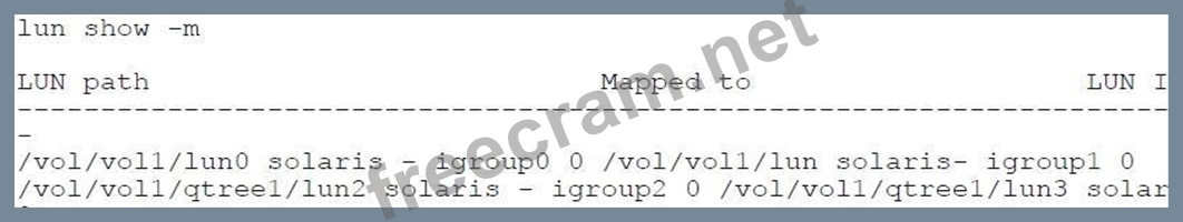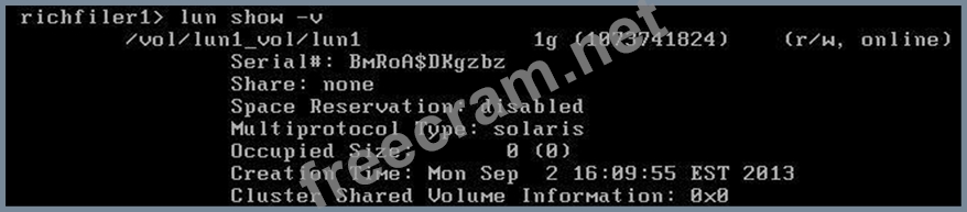 With the -v option supplied, additional information (comment string, serial number, LUN mapping, HA Pair Shared Volume Information) is also displayed. With the -m option supplied, information about lun_path to initiator_group mappings is displayed in a table format. With the -c option supplied, information about LUN cloning status is displayed.