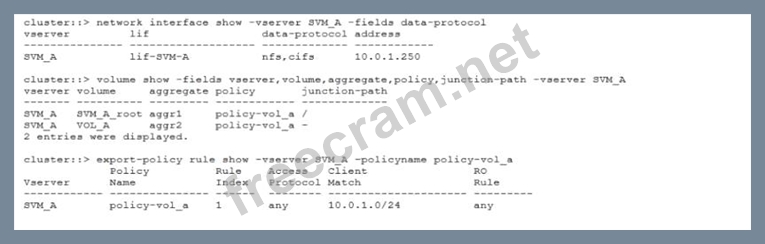 Explanation The problem is that the host IP address does not match the export policy rule. The export policy rule shown in the exhibit specifies that any client with an IP address within the 10.0.1.0/24 subnet can access the volume using NFSv3, as indicated by "Access Protocol" set to "any" and "Client Match" set to "10.0.1.0/24". However, the Linux host has an IP address of 10.0.1.24, which falls outside this range, leading to a mismatch between the host IP and export policy rule. To fix this problem, the export policy rule should be modified to include the host IP address or a broader subnet that covers it. References :- Add a rule to an export policy, vserver export-policy rule create, Create an export policy for the volume