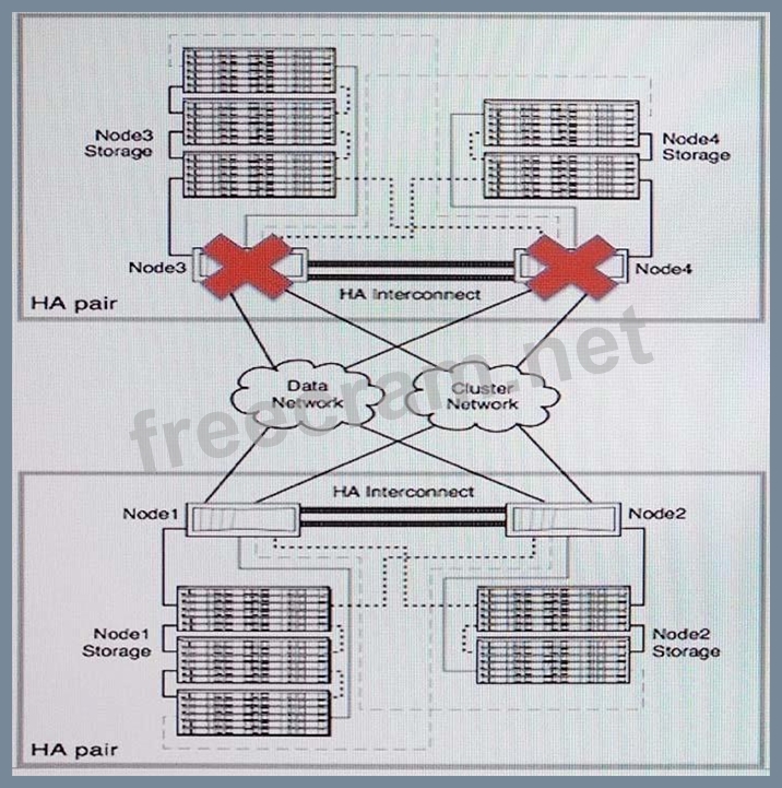 Click the Exhibit button. A customer has a 4-node cluster and wants to know what will happen to their data if one of the two HA pairs goes down. Epsilon is configured and working properly and is owned by Node1. Nodes 3 and 4 have failed as shown in the exhibit. What happens to the customer's data that is owned by the HA pair 3 and 4?