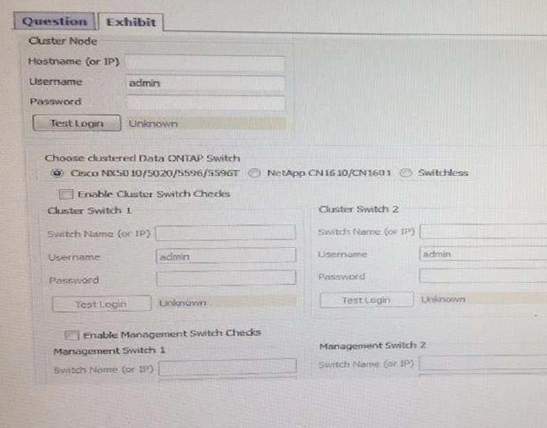 Explanation/Reference: In the clustered Data ONTAP profile, you can choose any one of the following (based on the network switch used): * Cisco NX5010/5020/5596 (Cisco switches is used in this question) * NetApp CN1610/CN1601 To verify clustered configurations, you should ensure the following: * The data is collected from cluster switches, management switches, and a controller. Etc. Reference: Config Advisor 3.2. Installation and Administration Guide, page 21