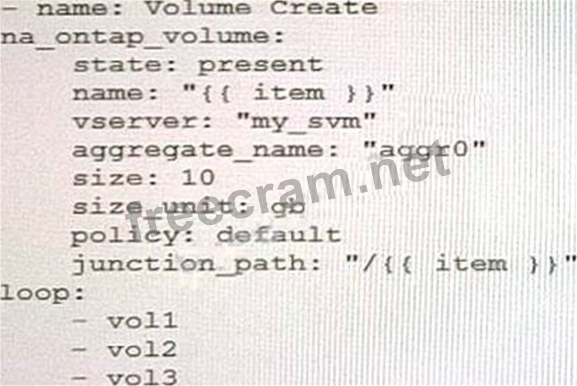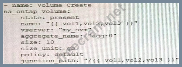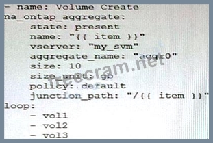 You are creating an Ansible playbook to deploy a NetApp ONTAP cluster. You want to take advantage of a loop to automate the creation of several volumes.