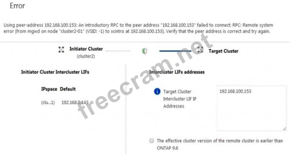 Cluster2 intercluster LIF IP: 192.168.0.143 Subnet: 255.255.255.0 Port: e0e passphrase: netapp1234 Cluster1 intercluster LIF IP: 192.168.0.153 Subnet: 255.255.255.0 Port: e0e passphrase: netapp1234 Referring to the exhibit, which statement is correct?