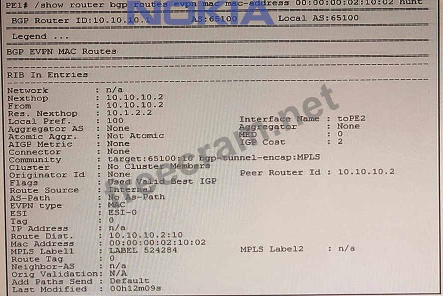 Explanation PE1 uses this BGP update to build the flooding list of the associated service. The update contains an IMET route that indicates that neighbor 10.10.10.2 is participating in a VPLS service with a network identifier of 10.