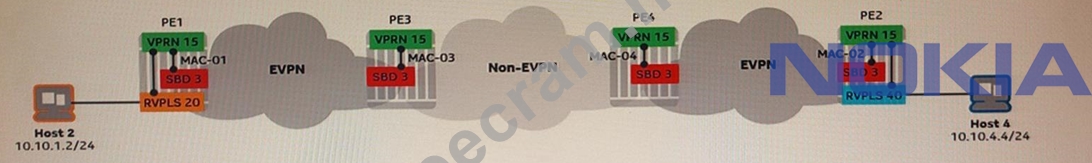 Explanation On PE3, the routing table for VPRN 15 does not contain an entry for 10.10.1.0/24. This entry is not needed because Host 1 is in the same subnet as the SBD IRB interface on PE3, and PE3 can reach Host 1 using its MAC address2. Verified References: Nokia Ethernet Virtual Private Network Services Course | Nokia