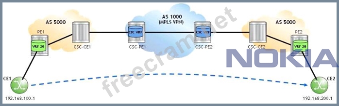 A Carrier Supporting Carrier (CSC) VPRN is configured for a customer carrier who is a BGP/MPLS service provider. If CE1 sends an IP packet to 192.168.200.1, which of the following is FALSE?