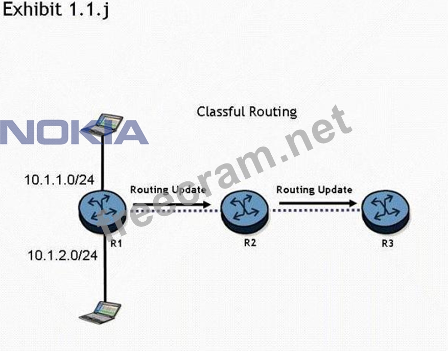 Routers R1 , R2, and R3 are running a classful routing protocol between them. Assuming that router R1 advertises all directly connected networks, how will these networks be represented in router R3's routing table?