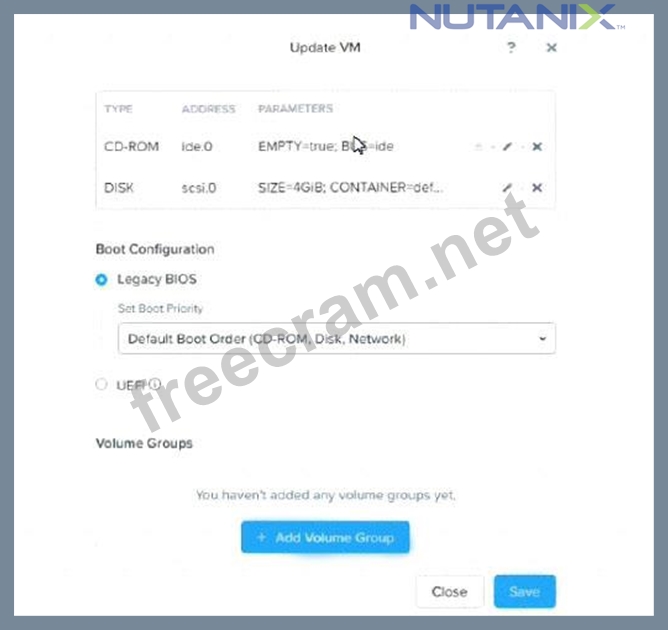 Refer to the exhibit. A team member has built a CentOS VM image for use as a template. An administrator deploys a new VM using the CentOS image as the 05 drive. No other drives are presented to the VM. Following the deployment, the administrator attempts to boot the VM, but is unsuccessful. What could be causing this issue?