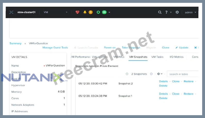 Refer to the exhibit. Management has tasked an administrator to restore the VM, VMforQuestion to a previous point in time (3:20pm), to recover from a corrupted set of files. Which snapshot should the administrator choose, and which action(s) should be executed?